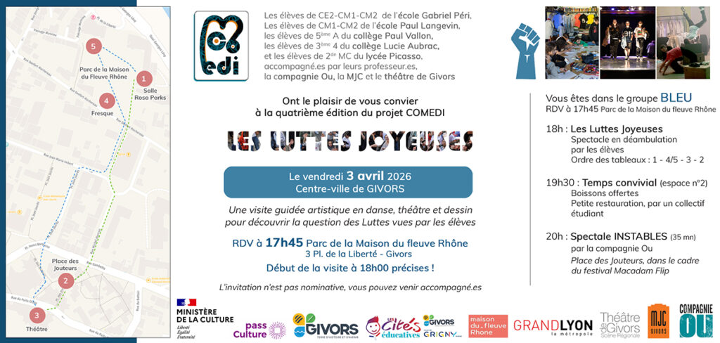 4eme édition du projet COMEDI « Les luttes joyeuses » accompagné par la Compagnie OU de Givors. Ce projet de territoire réunit la classe de 5éme A du collège Paul Vallon accompagnée par Mme Grange et Mme Pomares, les élèves de CE2 CM1, CM2 de l’école Gabriel Péri, les élèves de CM2 de l’école Paul Langevin, les élèves de 3ème 4 du collège Lucie Aubrac, les élèves de 2nde MC du Lycée Picasso accompagnés par leurs professeurs à la MJC et au théâtre de Givors. Un projet pluridisciplinaire, danse, théâtre, vidéo, arts plastiques où les élèves sont au coeur d’un processus de création guidés par des artistes professionnels.