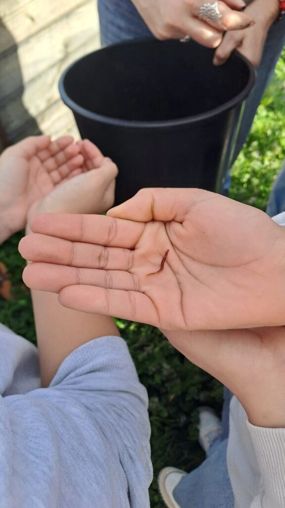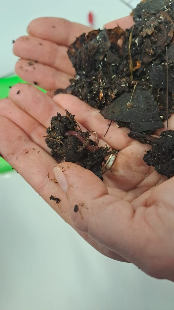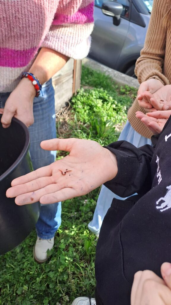 Après un rappel des règles sur le compost, les élèves ont observé et touché du compost en formation. Les collemboles étaient nombreux et bien visibles. Puis la classe s’est rendue au niveau des bacs et a remué le compost. Les élèves ont découvert les habitants de ce compost en formation : lombrics, collemboles ainsi que leurs prédateurs sur place : araignées et lézard.